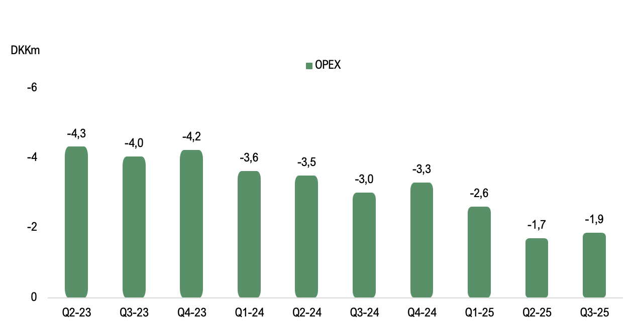 For the second consecutive quarter, STENOCARE reported a positive EBITDA result, amounting to DKK 60k, compared to DKK 20k during Q2-25 and DKK -3.6m during Q3-24. The positive EBITDA is driven by strong sales growth combined with a significant cost reduction, achieved through the new STENOCARE 3.0 strategy, under which the Company has repositioned itself as a trading and product development business for medical cannabis and consequently exited its cultivation activities. Through the updated strategy, operating expenses decreased by -38% during Q3-25, amounting to DKK 1.9m (3.0). It should also be mentioned that cost of goods sold (COGS) is included in the operating expenses, which is assumed to have grown Y-Y in line with the sales growth, suggesting that the underlying cost reduction is even greater than the reported 38% decline. The cash flow from operations amounted to DKK 0.06m (-1.9), in line with the improved result.