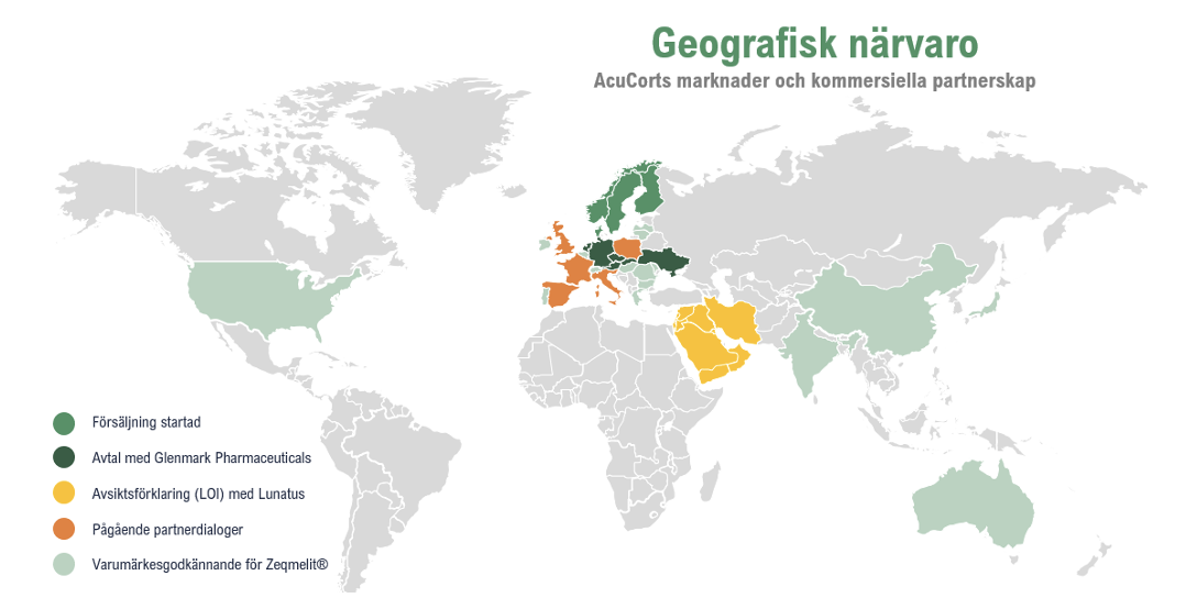 Glenmark Pharmaceuticals, ett av världens 100 största bioläkemedelsbolag med verksamhet i över 80 länder, valde under inledningen av år 2026 att ingå ett kommersiellt femårigt avtal med AcuCort avseende marknadsföring och distribution av Zeqmelit®, vilket utgör en strategisk milstolpe som inte bara breddar Bolagets geografiska räckvidd utan även stärker dess attraktivitet i pågående och framtida partnerdialoger. Avtalet täcker Tyskland, Nederländerna, Tjeckien, Österrike, Slovakien och Ukraina, marknader med en samlad befolkningsbas om ca 200 miljoner invånare, motsvarande ca 7x den nordiska hemmamarknaden.