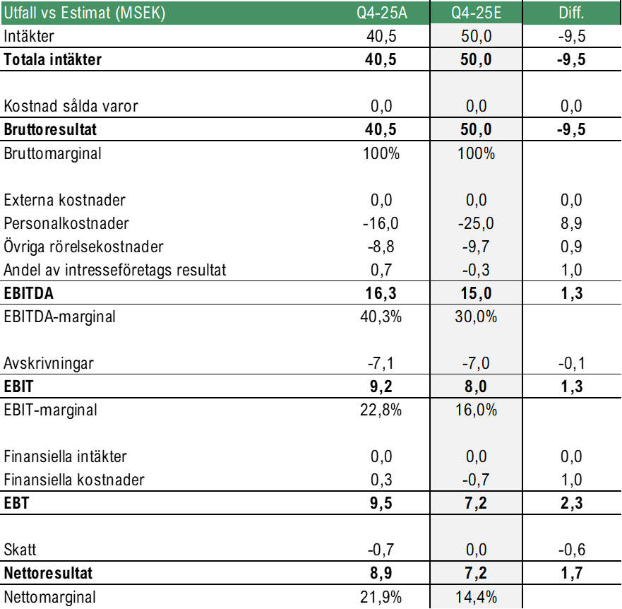 Trots att intäkterna underskred estimaten levererade EMB ett EBITDA-resultat om 16,3 MSEK för Q4-25, mot Analyst Groups estimat om 15,0 MSEK, vilket innebär en marginal om ca 40 % (estimerat 30 %), vilket är en väsentlig förbättring jämfört med Q4-24 (9,0 MSEK, 25 %). Den positiva avvikelsen mot estimat förklaras primärt av att personalkostnaderna uppgick till 16,0 MSEK, väsentligt lägre än Analyst Groups estimat om 25,0 MSEK, vilket medförde att EBITDA-resultatet ändå översteg förväntningarna trots det lägre intäktsutfallet, vilket Analyst Group bedömer vara hänförligt till den kostnadseffektivare organisation som det avslutade omstruktureringsprogrammet syftade till att etablera. Övriga rörelsekostnader uppgick till 8,8 MSEK, något under våra estimat om 9,7 MSEK, och omstruktureringskostnaderna under Q4-25 var försumbara om 0,3 MSEK, att jämföra med de 8,6 MSEK som belastade Q3-25. Nettoresultatet uppgick till 8,9 MSEK, mot estimerat 7,2 MSEK.