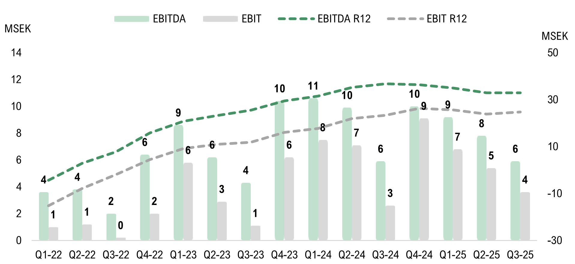 Under de första nio månaderna 2025 uppgick EBITDA-resultatet till 15,6 MSEK (17,2), vilket motsvarar en EBIT-marginal om 7 %, vilket kan jämföras med 7,2 % under motsvarande period föregående år. EBIT-marginalen är därmed marginellt lägre än föregående år, trots påverkan av både kalender- och valutaeffekter under tidigare kvartal, vilket ytterligare bekräftar en förbättrad lönsamhetsstruktur i Koncernen. Detta blir även tydligt sett till de senaste tolv månaderna (LTM) då EBIT-resultatet uppgick till 24,7 MSEK och motsvarar en EBIT-marginal om 8 %, vilket kan jämföras med 23,4 MSEK respektive 7,2 % under motsvarande period föregående år.