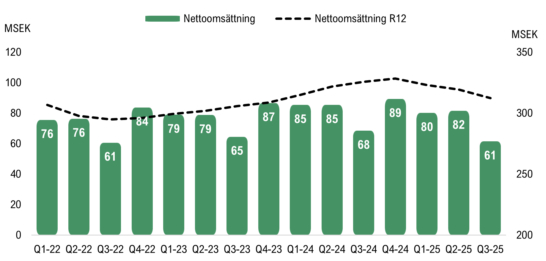 Nettoomsättningen för det tredje kvartalet år 2025 uppgick till 61,4 MSEK (68,4), vilket motsvarar en minskning om 10 % Y-Y eller 7 MSEK i absoluta tal och är cirka 9 % lägre än våra estimat för kvartalet. Där en minskad underkonsultaffär och renodlingen av Hifabs erbjudande har bidragit till en större effekt än vad vi hade räknat med. Detta i kombination med ett fortsatt övergripande avvaktande läge på marknad och en svag konjunktur har resulterat i en lägre omsättningen under kvartalet. Det tredje kvartalet utgör ett säsongsmässigt svagare kvartal förklarat av semestermånader, men kvartalet påverkas inte av någon kalendereffekt, där både Q1- och Q2-2025 haft en kalendereffekt med en (1) mindre arbetsdag för respektive kvartal i jämförelse med motsvarande perioder föregående år.