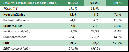 SciBase levererade Bolagets starkaste kvartal hittills med en nettoomsättning om 12,5 MSEK (8,6), en tillväxt om 45,1 % Y-Y och 57 % justerat för valuta, vilket översteg Analyst Groups estimat om 11,6 MSEK med 7,1 %. Den totala elektrodförsäljningen i volym ökade med 67 % till 28 634 (17 132) stycken, varav försäljningen till återkommande kunder ökade med 48 %, ett resultat som bekräftar att den förbrukningsdrivna affärsmodellen fortsätter att mogna och att inlåsningseffekterna i den installerade kundbasen stärks. USA utgjorde den primära tillväxtdrivaren, med en tillväxt inom hudcancersegmentet om 84 % Y-Y (106 % justerat för valuta) och en elektrodvolymtillväxt om 122 % Y-Y. Analyst Group bedömer att den seniora säljorganisation som etablerades i USA under H2-24 nu genererar tydligt kommersiellt genomslag, huvudsakligen hänförbart till teamets etablerade kliniska nätverk, vilket accelererar såväl nykundsrekrytering som ökad förbrukning i befintlig kundbas. Inom hudens barriär bidrog inledda leveranser till den kliniska studie med Castle Biosciences som beräknas starta under Q1-26, där ca 1 MSEK av det totala ordervärdet om 8 MSEK intäktsfördes under kvartalet.