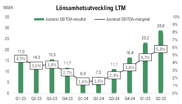 Koncernens lönsamhet har sedan början av år 2024 förbättrats markant, drivet av högre beläggningsgrad inom förskoleverksamheten samt en uppreviderad skolpeng, vilken tidigare släpat efter i kölvattnet av inflationsdrivna kostnadsökningar. Parallellt har balansräkningen stärkts väsentligt, vilket återspeglas i en justerad nettoskuld/EBITDA om 0,9x. Nettoskulden inkluderar hänsyn till den slutreglerade tilläggsköpeskillingen avseende förvärvet av Omniglot AB, vilken uppgick till 22,8 MSEK – lägre än det tidigare reserverade beloppet.